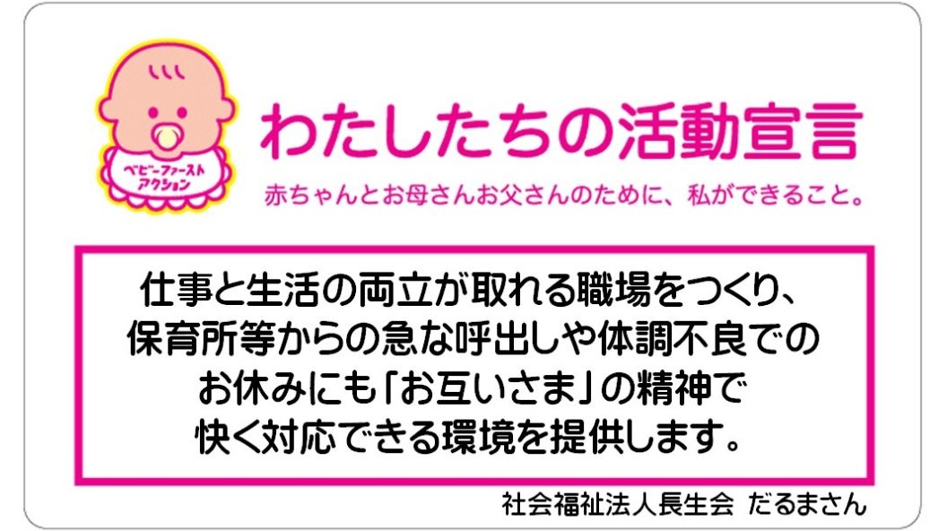 ベビーファーストとは、子どもを産み育てたくなる社会を実現するために、企業・自治体・個人が妊産婦をはじめ、子育て世代が過ごしやすい環境を醸成することを目指す運動に参画しています。