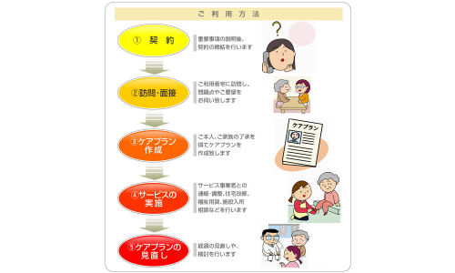 自分に合った暮しや、自分が望む生活を、住み慣れたご家庭で安心して続けられるように、介護に関する専門的知識や経験豊かなケアマネージャー(介護支援専門員)が要介護認定を受けられたご本人やご家族と相談の上、その人に合った介護保険サービス計画(ケアプラン)を作成いたします。また、介護サービスを利用される際の総合的な支援や、介護認定の申請代行など、介護や支援が必要な方の生活をトータルサポートしたします。